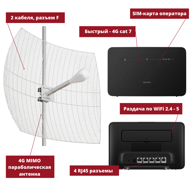 Универсаный комплект с усиливающей антенной и роутером 4G - это лучшиий вариант для стабильной работы беспроводного интернета за городом и раздачей мощной сети wi-fi для всех устройств.
