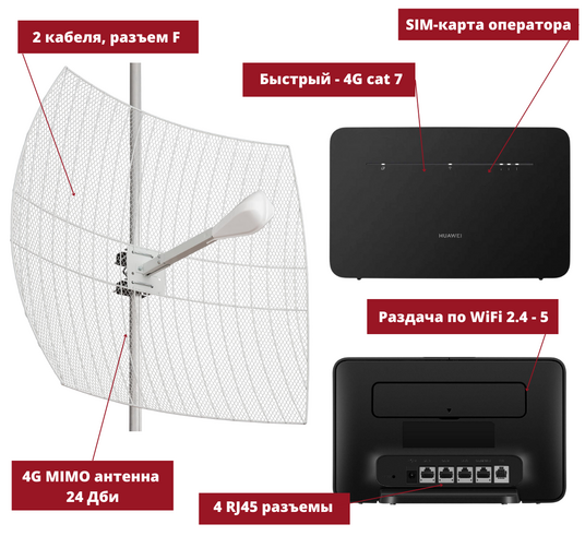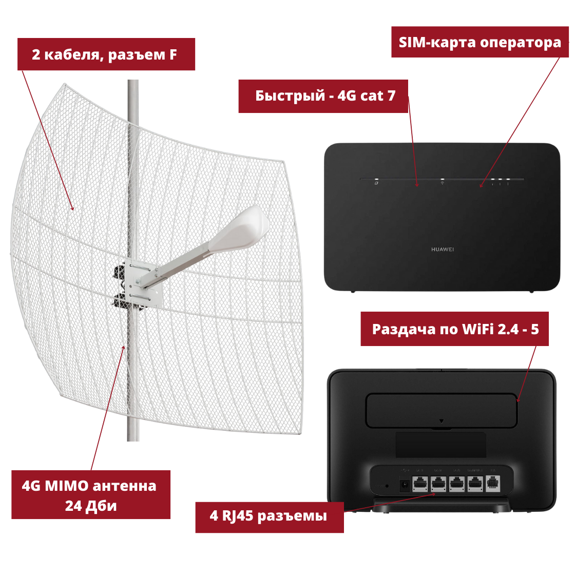 Готовый комплект "T435-27 cat.7" для усиления мобильного интернета за городом на основе 4G-роутера Huawei B535-232a и внешней параболической антенны KNA24-1700/2700С 24 дБ.